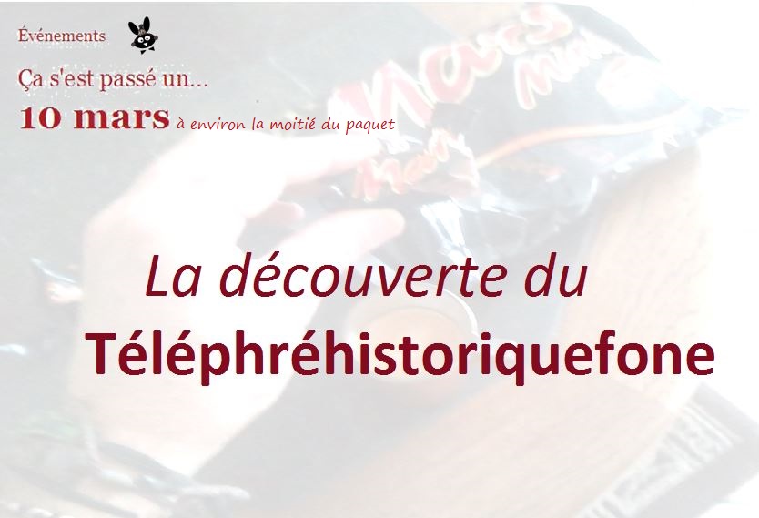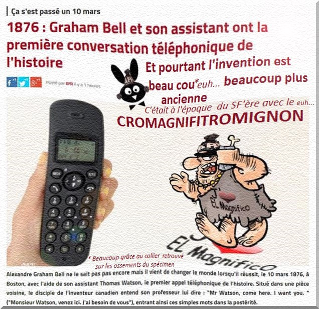 C’était aussi un 10 mars 3000ans avant notre ére La découverte du euh... "téléphréhistoriquefone" Mais (non en mars) Etant le seul et l’unique utilisateur de l’époque du SF’ère L’invention est tombée dans l’oubli... À moins que ce soit un diplodocus à poil ras Espèce très fréquente à cette période, qui aurait écrasé, Involontairement (quoique pour le faire taire). Le premier prototype du "Cromagnifitromignon" et sa diabolique invention.. ---D’après les sources histo euh….préhistorique--- Le euh… "Cromagnifitromignon" à la recherche du réseau SF’ère Juste avant la rencontre avec le un diplodocus à poil ras