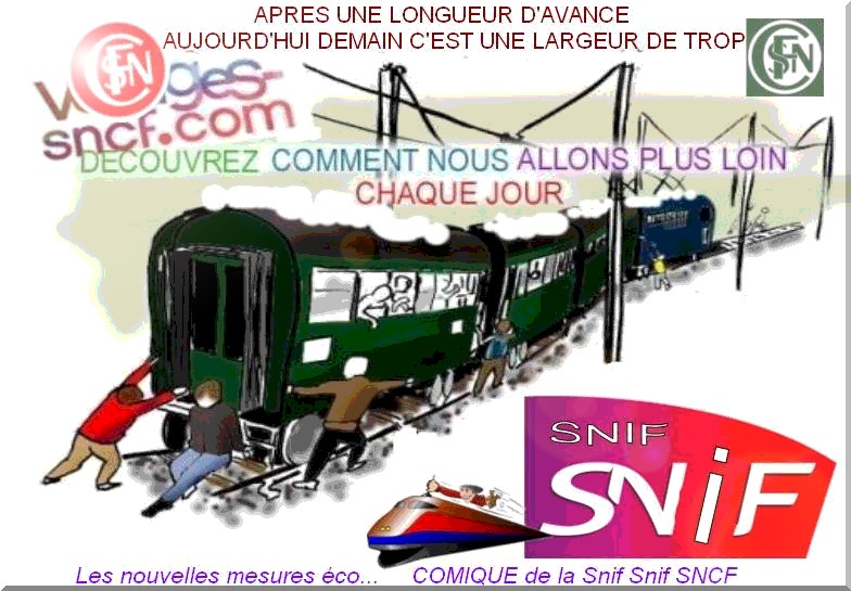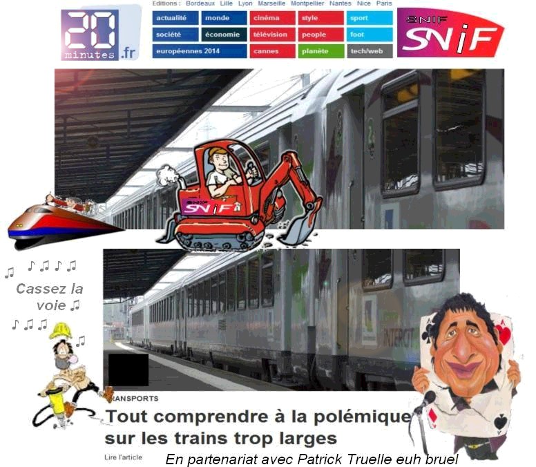 APRES UNE LONGUEUR D'AVANCE AUJOURD'HUI DEMAIN C'EST UNE LARGEUR DE TROP Les nouvelles mesures éco...COMIQUE de la SNIF SNIF CF qui a reconnu, qu’elle allait devoir raboter 1.300 quais car les nouveaux trains régionaux sont plus larges que les précédents… Des trains trop larges, des quais trop étroits... C'est une situation "comiquement dramatique" de l’aveu même de Frédéric GULLIVER euh Cuvillier, secrétaire d’Etat aux Transports. 20 Minutes et EL MAGNIFICO font le point sur la polémique… Certes TOUT AUGMENTE mais quand même... Comment a-t-on pu construire des trains trop larges pour les voies? Beaucoup des nouveaux trains ont été construits à une époque où il n’existait pas de norme. Résultat: l’écartement entre deux quais ou entre le quai et la voie n’est pas le même dans les différentes gares de France. Selon le Canard enchaîné, c’est pourtant la SNCF qui a défini le cahier des charges avec, notamment, les dimensions des nouvelles rames. «Or les savants ingénieurs ont omis de vérifier les dimensions sur le terrain.» D'un autre côté ... Bonne nouvelle la SNIF SNIF CF est porteuse d'emploi... Elargissement des voix euh des voies comme chantait Paa...aatrique (Pas trique) L'As désastre euh l'As des As " Cassez la voie " ------ d'après une information de l'Arc en Ciel qui d'ailleurs a beaucoup de travail en ce moment Pluie soleil et puis pluie