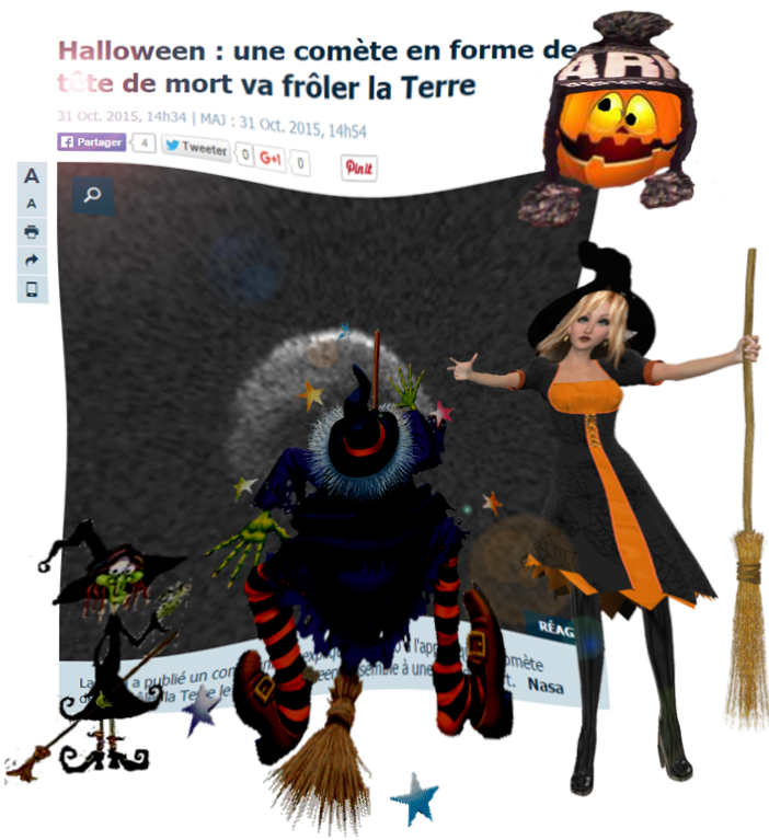 HALLEY euh... HALLOWEEN 2015 Ce n'est pas une nuit à euh… à faire des plans sur la comète Ne Sortez pas vos Bonnets euh… Vos BALAIS Comme disait l'autre... Je rigole face au danger… Ensuite je cherche un trou pour me cacher… ------- L’avantage de la nuit de Halloween , quand il n'y a pas la comète qui risque de frôler la terre… C’est qu’il y en a… Qui vont pouvoir sortir sans se euh...tartiner de maquillage ------ Le con euh...comble c'est que Elles sont bien noires, les pensées des nuits blanches... ------- Est-ce que je crois aux fantômes ? Non, mais j’en ai peur. ---El Magnifico met à votre disposition un numéro vert--- euh...orange Numéro Alerte Hallowen Allo... halloween Ici... citrouille.