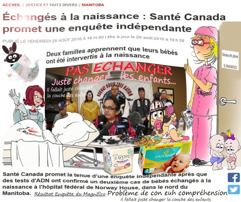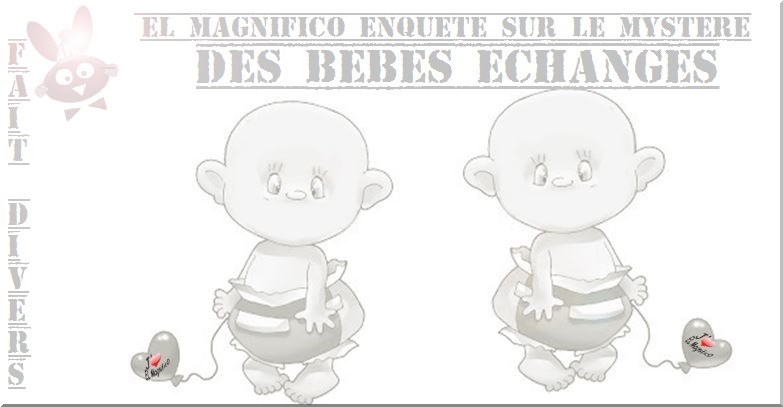 ECHANGE de euh… deux de bébés. Aujourd’hui, le Résultat de "El Magnifico enquête" Il s’agit d’un problème de con euh… compréhension Il fallait comprendre : Changer la couche des enfants,et non échanger la souche des enfants… Quoique euh…ils sont de souches indiennes, non ? Cependant, afin d’éviter de reproduire ce drame EL MAGNIFICO vous conseille d’utiliser les couches PAM PERDRE et T QUI ? ---conseil du magnifique--- Choisissez cette marque-là... (Je ne couche euh...touche pas de commission). C'est plus sûr... Et pour une couche, c'est très important d'être sur (même en dessous) sinon, on a vite fait d'être dans la euh...m ... !