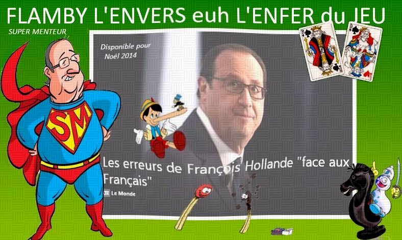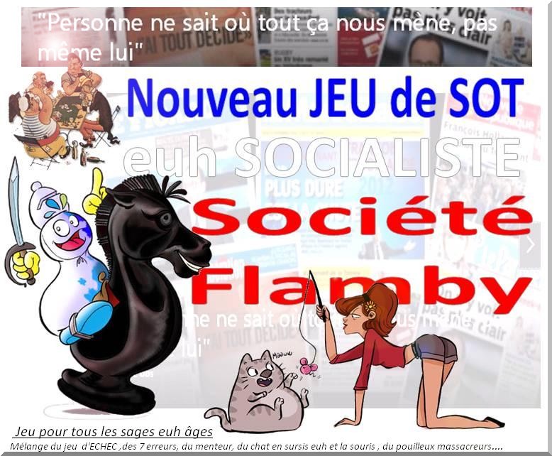 En AVANT PREMIERE et sur TF1 LE NOUVEAU JEU DU PARTI SOCIA..euh PARTIE de SOCIETE FLAMBY a L'ENVERS euh L'ENFER du JEU Sur le tapis vert...fête euh faites vos oeufs euh Jeux Disponible pour Noël 2014 Un mélange de plusieurs jeux classiques Tel le Menteur, les ECHECS, les jeux des 7 Erreurs. ---culture--- Comme disait Savielli Tartacower. "Les erreurs sont là pour être commises. " certes...mais bon Flamby ce n'est pas bon ( pour nous)