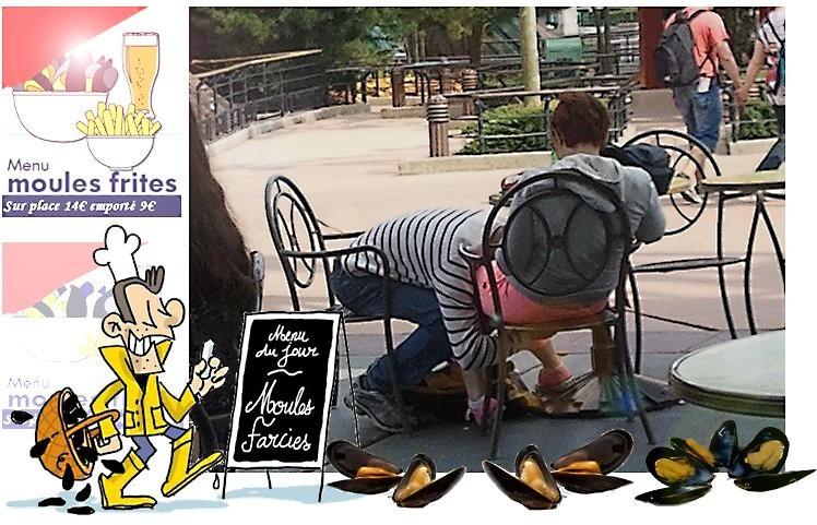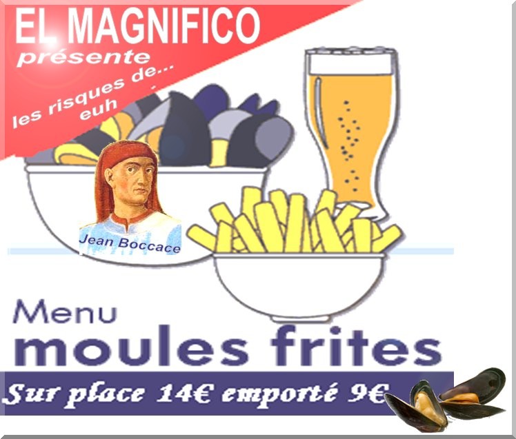 Attention aux risques de manger de la..moule pas fraîche Voici ce qui peut arriver : Il en est du romantisme fiévreux comme de la moule pas fraîche Quand on en abuse, ça fait mal au cœur... Pierre Desproges mais bon... le mâle euh le mal n'est pas partout et comme écrivait Jean Boccace C'est souvent l'amitié qui fait naître, nourrit et entretient les plus beaux sentiments de générosité dont le coeur humain est capable. Alors n'ayez plus peur d'avoir mal au coeur ! Mangez des moules... ------ Avec la participation de la Moule de Bretagne * directement de la mère euh la mer à la fille...euh à la file d'attente du Restaurant : " Chez EL MAGNIFICO " Moules Frites sur place à 14€ emporté 9€