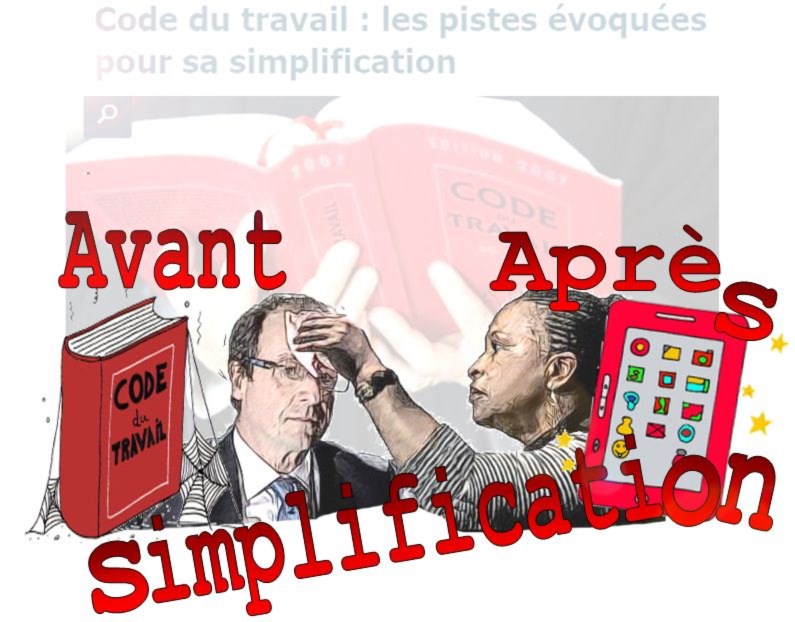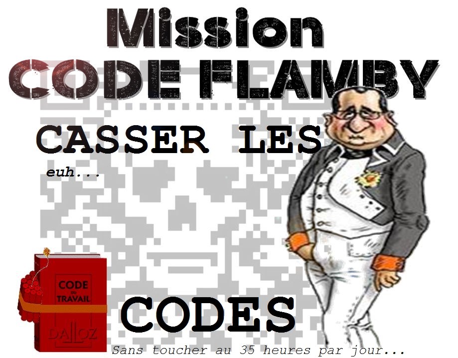 Afin d'atteindre enfin la baise euh... Une baisse significative, dans le monde du travail, Un seul code d’horreur euh… d’honneur pour notre Flamby National. Modifier le monde du travail. Ne plus compter le nombre de "sans emploi". Mais compter le nombre de euh... travailleurs qu'on ploie euh...qu'on emploie. ---Changement de régime pour le code du travail--- En quarante ans le code du travail, qui pesait 300 grammes, est passé de 600 articles en 1974 à plus de 8 000 aujourd'hui et plus de 3 000 pages pour un poids de 1,4 kg ! ------ Avec l'aide de la mère T’obéiras. Pour voir l'article cliquez sur le code du travail "Version T'Obéira" Simplification du code. Illisible, obèse, trop complexe... Flamby le guerrier a décidé, lors de sa conférence de presse, de s'attaquer à ce chantier... Les mauvaises langues disent que c'est flou... Avec El Magnifico, il suffit de cliquer sur l'image pour con euh… Comprendre la stratégie de notre en pire euh... Empereur de la réforme. Informatiser le code, c'est novateur, non ?