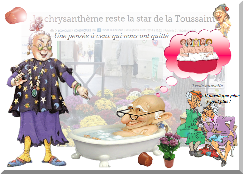 Faites des défunts, euh ce n'est pas faux comme disait l'Ankou en nettoyant sa ...euh son outil. Après la fête de tous seins... Aujourd'hui c'est la fête des morts. Pas de pot (de chrysanthème) pour pépé... Pas toujours car … Mais d'un autre côté mon pépé me disait toujours en parlant de sa vie sexuelle : À 20 ans, je n'arrivais pas à plier mon sexe Tellement il était dur... à 40 ans, j'arrivais presque à le plier en deux... à 60 ans, je le pliais en trois... Maintenant,à 98 ans,j'arrive à le rouler ! C'est incroyable comment... avec l'âge, j'ai pris de la force dans les bras ! tant qu'il y a de l'envie,il y a de l'espoir