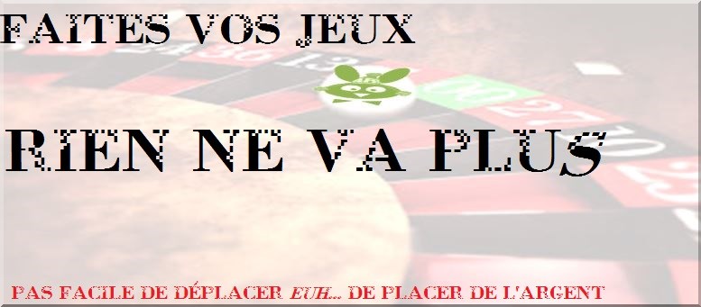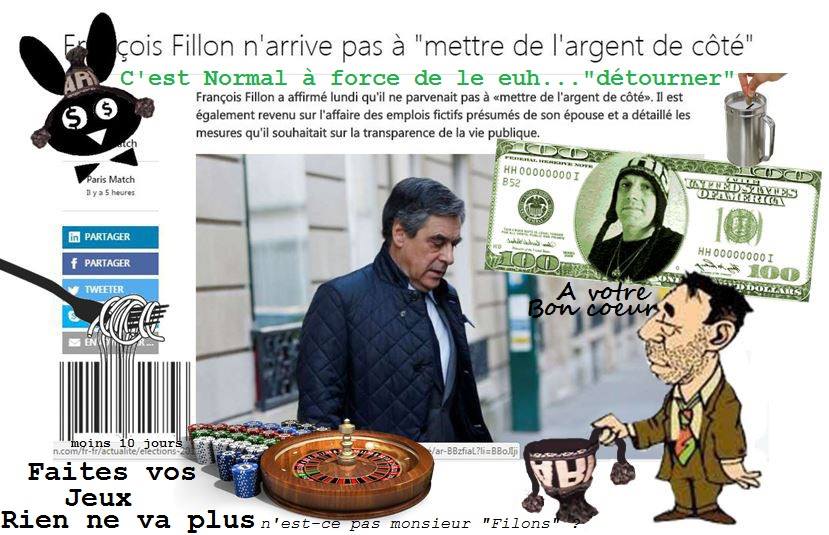 Pas facile de déplacer euh... de placer de l'argent À gauche quand on est de droite.... Quelque part c'est normal, pour notre pauvre F.F dit "courage filons" qu’il n'arrive pas à placer de euh...l'argent à force de le euh... détourner ! Ça tourne, ça tourne... Faites vos jeux… Rien ne va plus, n'est-ce pas, ?