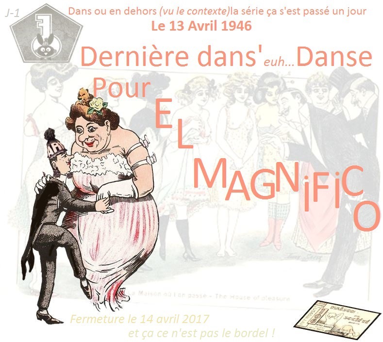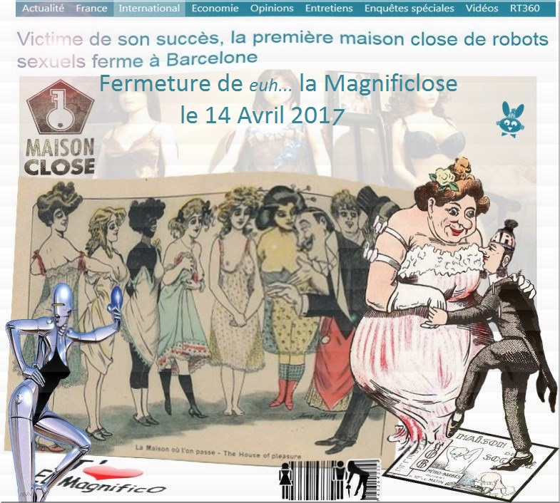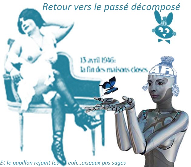 Dans ou en dehors (vu le contexte) la série ça s'est passé un jour. 13 avril 1946 Fermeture des maisons closes Comme disait Arletty "Fermer les maisons closes, c'est plus qu'un crime, c'est un pléonasme " El Magnificlose rajoute histoire de closer euh…causer bien entendu… Je plais aux miasmes, et je n'aime pas ça alors, on ferme Pour le "el Magnifico" c'est Fermeture le 14 Avril 2017 FIN du BORDEL La loi Marthe Richard, du nom de la conseillère municipale de Paris qui l'a élaborée, est votée par la gouvernement provisoire. Elle impose la fermeture des maisons closes en France. 20 000 femmes environ sont concernées par cette loi et près d'un millier de maisons de tolérance ferment leurs portes. Et même Edith de Nantes n'a pas pu faire grand chose à part que ça tombe aussi un 13 avril ---13 avril1598--- Signature de l'Edit de Nantes Evolution de l'espèce d'euh... Va savoir ------ Retour vers le passé des cons euh… décomposé Avec l'ère des machines, beaucoup d'esprits se croient robots... EL MAGNIFICO n'est pas robot, il est trop beau… Et ça c'est un vrai pléonasme qui me plait quand même… ------ Robot c'est bien mais rien ne vaut le euh…