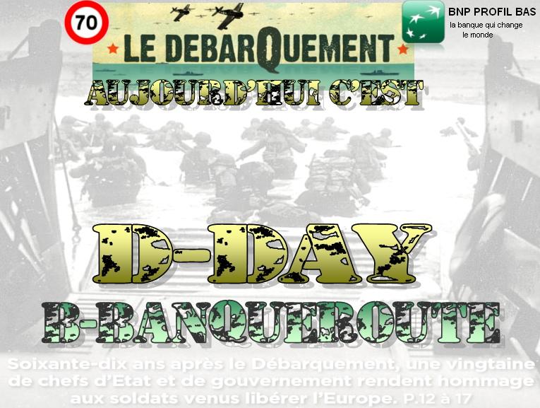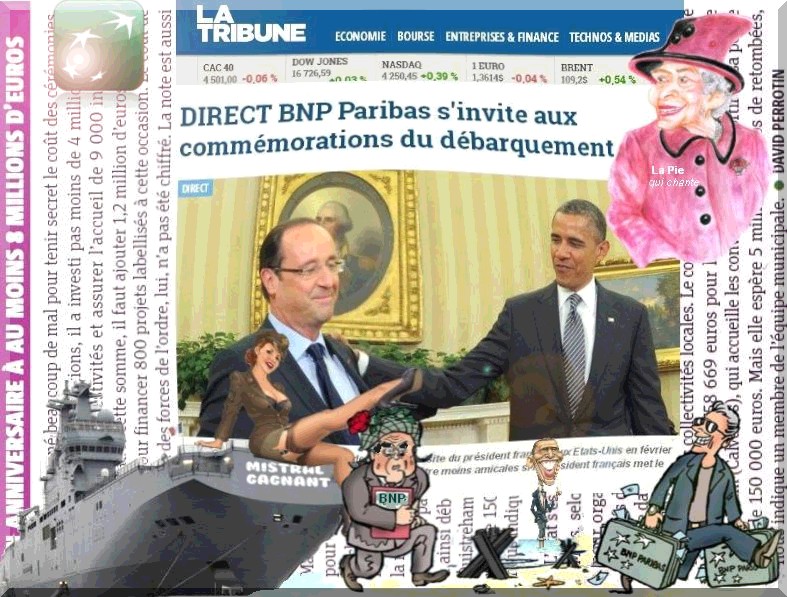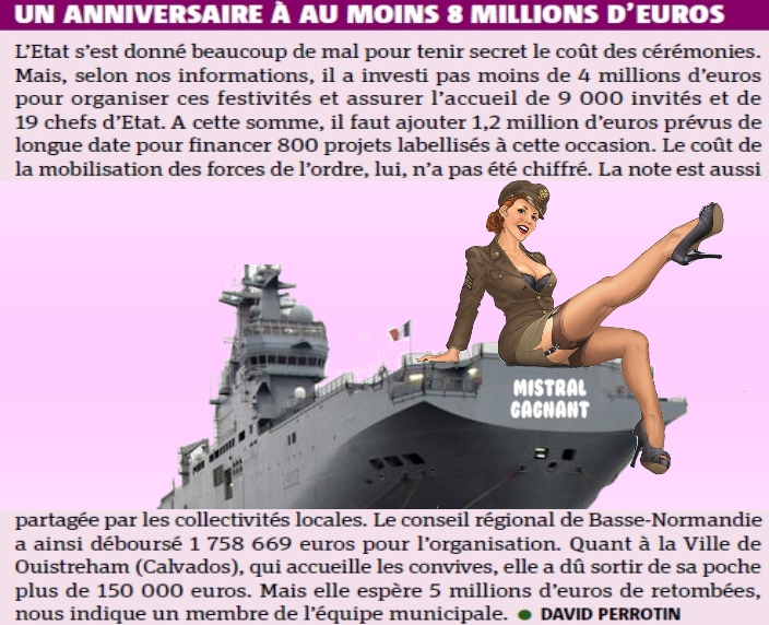 Aujourd'hui Opération D-Day et par la même occasion B-Banqueroute En parlant d'opération EL MAGNIFICO se demande combien ça coûte Les Tas donne(nt) aucun chiffre officiel TOP SECRET Mais d'après le journal Environ 8 millions Pour un bénéfice attendu de 5 millions On comprend mieux les déficits... Bonne gestion de nos grands hommes politiques Remarque entre SANCTION et AMBITION voir CORRUPTION Les amendes de la BNP qui fait le Profil bas Pas bien de contourner un embargo américain contre Cuba, l'Iran et le Soudan Contrat de livraison de deux navires porte-hélicoptères Mistral * ça c'est de la sanction économique ------ La Phrase du jour à ces hommes qui dirigent le monde Ces alliés qui s’évitent pour esquiver le con euh la confrontation. Le nombril (surtout le votre) n'est pas fait pour être regardé mais pour porter les drapeaux dans les défilés En plus,ça tombe bien c'est le... jour. Partout où,ces grands ont... pacifié. On constate les résultats : " L'alibi qui traîne et qui ...raque "