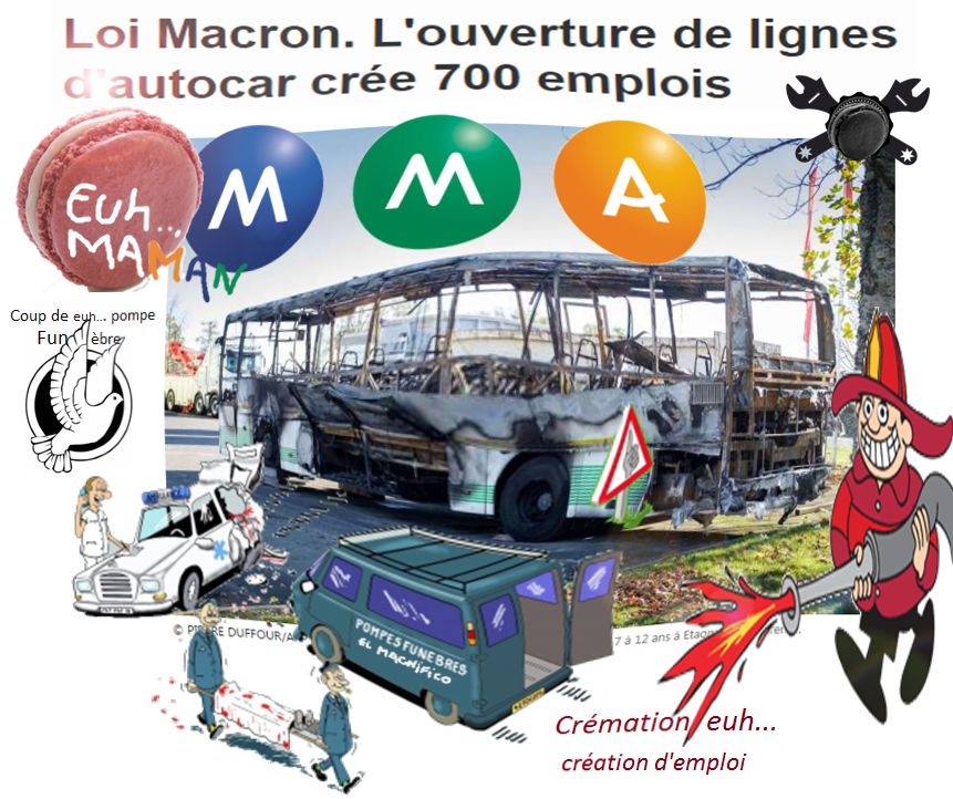 Comme disait Georges Bernanos* On ne subit pas l'avenir, on le fait... Avant, j’étais chaud chaud euh...(et surtout marron). Chômeur mais ça c'était avant la... " LOI MACARON " Maintenant, c'est du GÂTEAU Dans le secteur des assurances, des pompes funèbres, des pompiers et descartes euh... des cars.. Le Manuel Macaron lance sa deuxième loi fourre-tout... A vrai dire, le ministre de l’économie ne semble même pas sûr que... Euh... son texte soit nécessaire : Je ne sais pas quelles sont les bonnes réformes sur ce sujet. Peut-être que, même, il n’y en a pas. Peut-être que les choses se font seules a philosophé lundi M. Macaron.