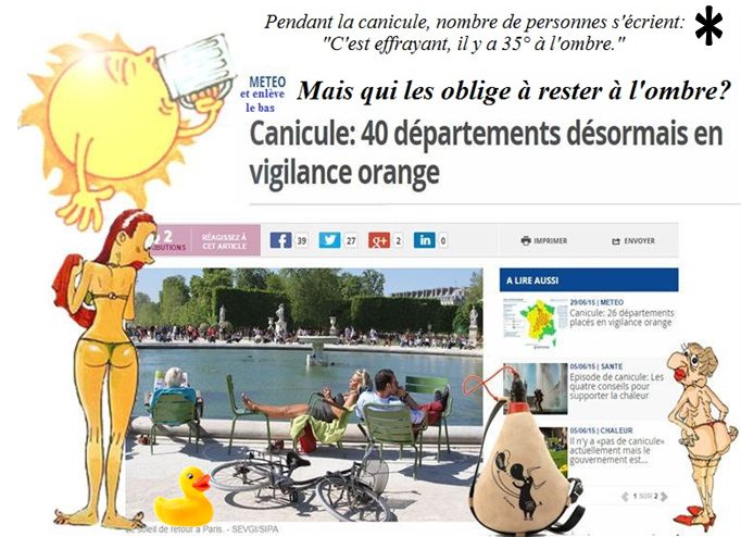 La ministre de l'Ecologie et du Développement durable a rappelé quelques "gestes simples" à effectuer durant les épisodes caniculaires. "En plus de boire de l'eau régulièrement, s'humidifier la tête, le corps et les vêtements", A-t-elle préconisé. A quand le concours du tee-shirt mouillé à l'Elysée ? La canicule, c’est chaud… Mets tes hauts et enlève le bas AVANT Il fallait écarter le maillot de bain pour voir les fesses, MAINTENANT Enfin, le changement c'est maintenant… C’est le contraire, il faut écarter les fesses pour ...