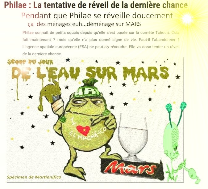 Trace de peinture euh...de vie sur Mars Après l'eau,c'est là euh... La découverte d'une nouvelle forme de vie sur la planète rouge* A découvrir... En attendant que Philae se réveille... Ça déménage chez les... Experts (amis amis) qui se penchent sur le phénomène, à la limite de se casser la gu...