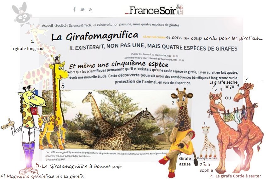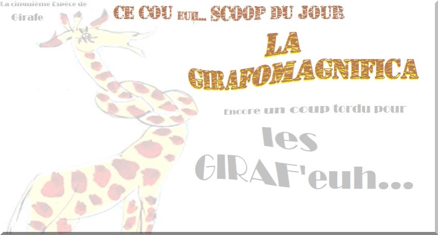 Le Cou euh... SCOOP du Jour. Les scientifiques estimaient jusqu'à présent, qu'il existait une seule espèce de girafe (Giraffa camelopardalis). Et bien c'est faux, Il en existe au moins quatre… Plus UNE que le grand et sublime El Magnifico spécialiste de la giraf'euh... vous présente aujourd'hui. "La GIRAFOMAGNIFICA" (la Giraffa fégaf au bôlongbonnédeuh'pariis) ---Info pour être au cou euh au courant sur les différentes espèces de girafes--- 1.La girafe classique à long cou 2. La girafe assise, 3.La girafe Sophie, 4.La girafe sèche-linge ou corde à sauter (en période de reproduction) 5. Et bien-sûr La" Girafomagnifica " Espéce d'euh ... Rare par son bonnet à longues tresses. ---Con eu... plément--- *L'étude, dont les résultats sont parus dans la revue scientifique Current Biology, s'appuie sur l'analyse de l'ADN de plus d'une centaine de girafes. «Nous avons étudié les liens génétiques de tous les sous-groupes de girafes sur l'ensemble du continent africain et nous avons découvert qu'il existait non pas un mais au moins quatre groupes très distincts génétiquement qui, apparemment, ne se reproduisent pas entre eux», explique le professeur Axel Janke, chercheur à l'Université Goethe de Francfort en Allemagne.