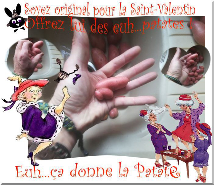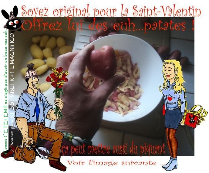 La Saint-Valentin vu par EL MAGNIFICO Il n'y a pas que euh... Seulement les roses à offrir... "Soyez original" Reste à trouver la ou les bonnes patates Comme c’est ELLE qui l’aime * Cliquez sur l’image ci dessous Attention personne sensible s’abstenir. Ne euh… pas cliquer sur le lien Les patates… Ça donne la patate … ------ *Il ne s’agit pas d’avoir un beau nez et bonnet Pour ressembler à El Magnifico (Voir l’image principale) Un peu plus haut "Je ne suis pas un musclor" "J’ai juste un corps de rêve"
