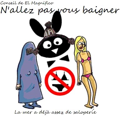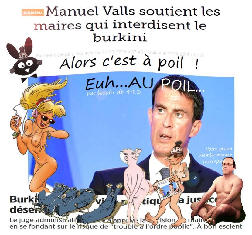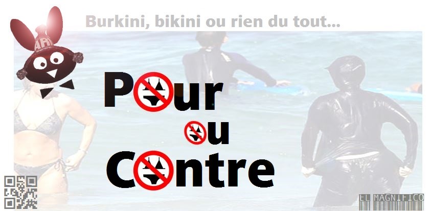 Pour ou contre le BURKINI* L’année ou le bikini fête ses 70 ans, nouvelle peau qu'tu niques euh...polémique. C’est vrai qu'en FRANCE, nous n'avons que depuis cet été des nouveaux coustumes euh...de nouvelles coutumes religieuses "Le port du BURKINI." Sans frais de porc, par temps d'état d'urgence... ORDRE PUBLIC, pour éviter le désordre : Range dans ton armoire, ton soutien-gorg'euh... Le burkini objet de nature à exacerber des tensions. L'état ne prenantaucune décision (il ne veut pas se mouiller...) sur un sujet aussi "brulant", il appartient donc aux Maires d'imposer une réglementation sur les plages et autres lieux de vacances. Un simple arrêté municipal devrait suffire. Ceux qui ne s'y plient pas devant payer une amende. Si la grande majorité des élus appliquaient cette interdiction, la "contagion" du birkini cesserait d'elle- même au lieu de se répandre comme une tâche d'huile. La faiblesse des politiques est consternante ! D'un autre côté "Chassez le naturiste, il revient au bungalow " ---Conseil du Magnifique--- *Une tenue portée par les femmes qui ne souhaitent pas, exhiber leur corps lorsqu'elles prennent un bain de mer. C’est dommage quoique... Pour certaines il faudrait mieux ...