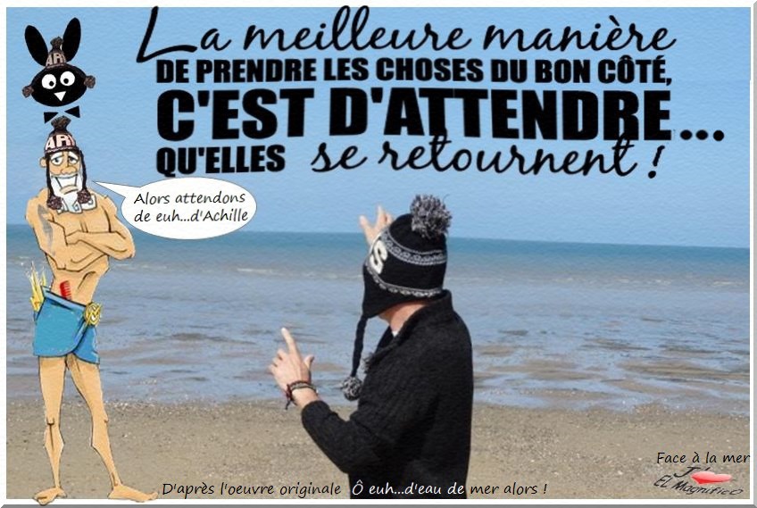 Prendre les devants derrière. Comme disait l’autre, La meilleure manière de prendre les choses du bon côté C’est d’attendre qu’elles se retournent... Certes, mais quel est le bon côté ? Cela n’a pas de sens… Pour Vous, "El Magnifico"votre dévoué serviteur l’a testé, et vous donne la manière d’inverser la tendance. Rester toujours positif contre vent et marée… Sous le vent euh… souvent c’est le recto, Cependant, il y a aussi le euh...côté "Verse l'eau". Surtout au bord de la mer,quand c'est le cycle des marées... Alors attendons (d’Achille) que euh… Ça tourne. L’important c’est de ne pas l’avoir dans le euh… D’après l’œuvre" Le Haut qui sait " de l’Eau de Mer *