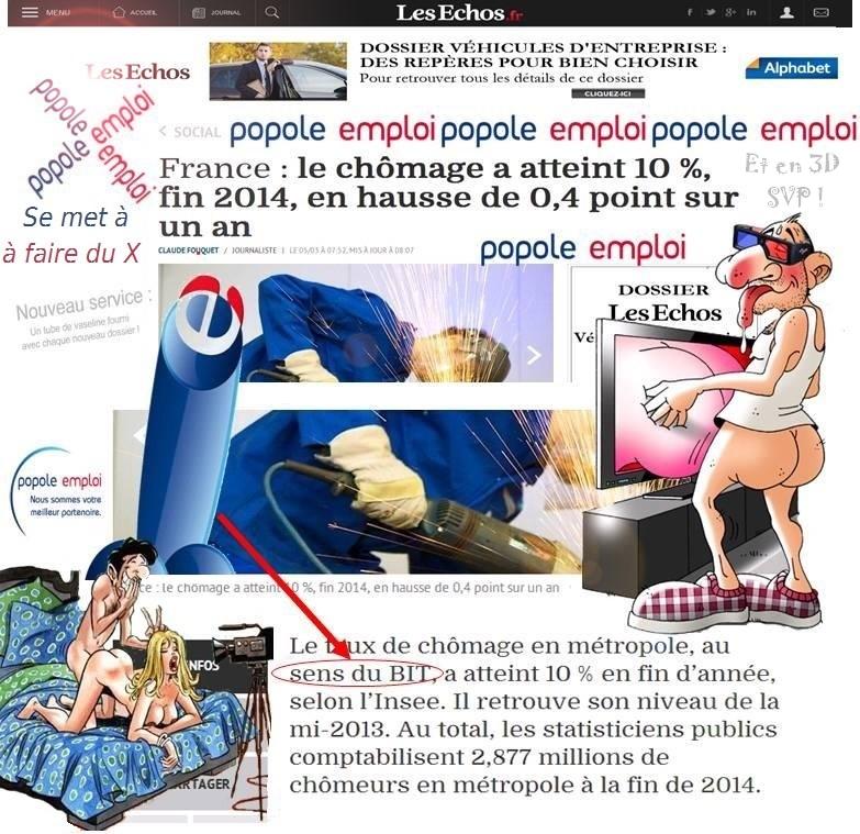À l'heure où le chômage est au plus haut, toutes les pistes semblent bonnes (hummm) à explorer pour Popole Emploi Peut-être une solution pour inverser la courbe ? Euh… j'ai quand même un doute là-dessus, pour inverser...euh... la courbe qui a plutôt tendance à ...monter. du SHOW MAGE euh chômage Avec la BIT * euh d'après un.... Cale cul euh... calcul de l'Insee selon la méthode du euh... Bureau international du Travail. (BIT), Et comme disait Jean Yanne "L'amour est aveugle." La preuve, en le faisant il y a des gens qui braillent.