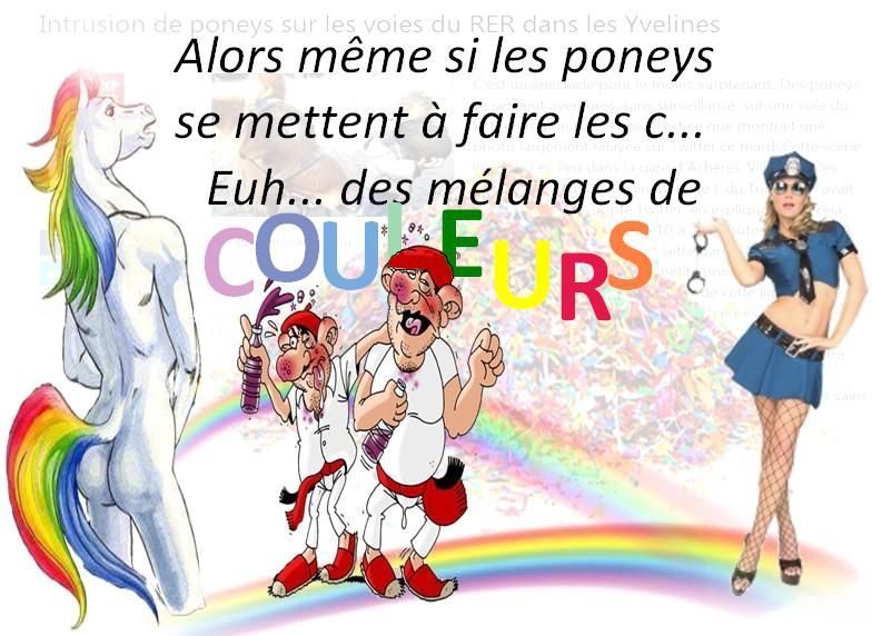 Les couleurs de l'avis euh la vie... Quoique, en parlant d'avis Des goûts et des couleurs,on ne discute pas. Comme disait Régis Hauser dans "Les Murs se marrent". En mélangeant un garçon rouge d'excitation avec … une fille bleue de peur vous obtenez du violé.* El Magnifico s'inquiète... Euh... l'inverse est-il aussi vrai ... Certes, El Magnifico ne voit pas encore les choses en rouge, ni en violet, non plus, en buvant son jus d'orange. C’est juste du dégoût... Quitte à être marron, autant choisir la femme en bleu, pour se mettre au vert.