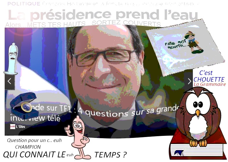 Ce soir : "Sortez couverts" Il paraît que..euh… La présidence prend l'eau. Il est donc temps d’euh changer de temps... Nouvelle Réforme ...Nouveau Temps (en gardant le rythme) "Le Préservatif imparfait." Ce soir le grand oral pour garder le...mort euh moral de notre Flamby. Parmi les quatre questions En exclusivité pour vous EL MAGNIFICO....vous dévoile l’une d’elle. A quel temps est conjuguée la phrase suivante ? "Ils ne voulurent pas avoir d'enfant,mais ils en eurent six." Qui connait ce temps ? Flamby notre Sauveur sait Comme lui un nain parfait avec la participation des preservatifs pine ...euh pinocchio Si Papaflambyoland en avait pris un On ne serait pas dans cette m...euh... Misère