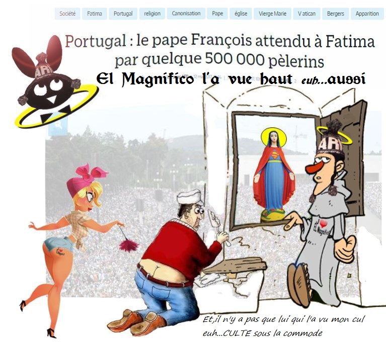 Dans la série s'est arrivé ce jour Le 13 mai, cent ans après... Apparition de la V.2017(vierge version 2017) EL MAGNIFICO l'a vue Et, il n'y a pas que lui qui a vu la vierge. ---Cul euh culture générale--- 13 mai 1917 Apparition de la Vierge à Fatima Francisco, Lucia et Jacinta, 3 enfants de Fatima, un petit village portugais, sont témoins d'une apparition lumineuse tandis qu'ils gardent leurs moutons. Ils racontent que la Vierge les a convié à six rendez-vous successifs tous les 13 du mois et qu'elle leur a confié trois secrets à ne révéler qu'au pape. Le lieu des apparitions (Cova da Iria) deviendra un pèlerinage mondial très fréquenté et une immense basilique sera construite à proximité. ---Blasphème--- PARADIS con euh...compromis pour El Magnifico, le mâle sain qui rêve d'être entouré de euh... seins Mais comme chantait Daniel Balavoine L'avis euh...la vie ne m'apprend rien… "Leurs évangiles ont fait de moi un non croyant " La mort sera toujours l’amor et… D'un autre côté L'Enfer , c'est le paradis du diable alors...