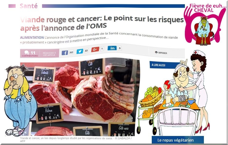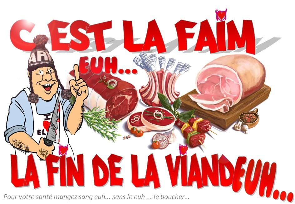 Manger de la viande, c’est mettre sa santé, sa vie en... dent euh... en danger. De nombreuses études scientifiques démontrent le lien entre maladies cardiovasculaires, cancers, attaques cérébrales, diabète… et la consommation de viande. Alors c'est la faim euh... la fin de la viande. Comme dit le Laurent Avec tout ce qu'on nous dit sur la viande, pour continuer à en manger aujourd'hui, Faut vraiment être boucher ! Mais Coluche avait la solution Il suffirait que les gens n'achètent plus pour que cela ne se vende pas...