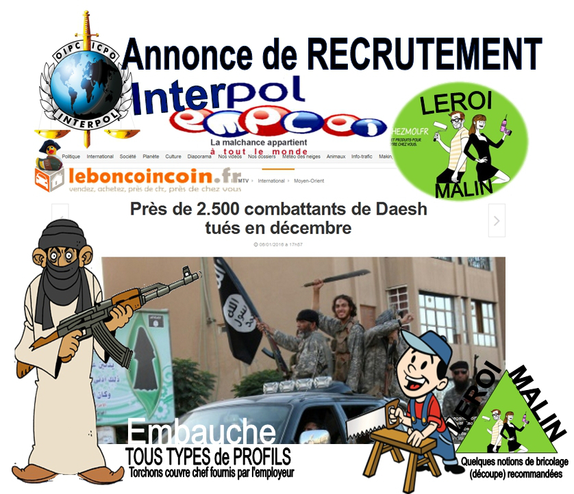 Vive la liberté de pression Le Travail c'est la Santé* Attentat raté pour un kamikaze Encore un de moins… Alors que le chômage se stabilise vers le haut C’est la crise pour E.L pour ne pas dire la "dèche" Heureusement Interpol emploi est là... Tous types de profils E.L se moque du profil un torchon sur la tête et hop... L'important c'est de vouloir et pouvoir s'éclater Cependant, quelques notions de bricolage sont souhaitées... ------