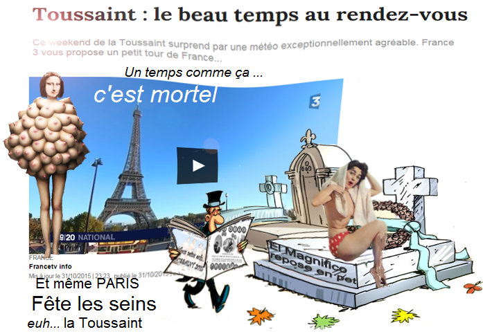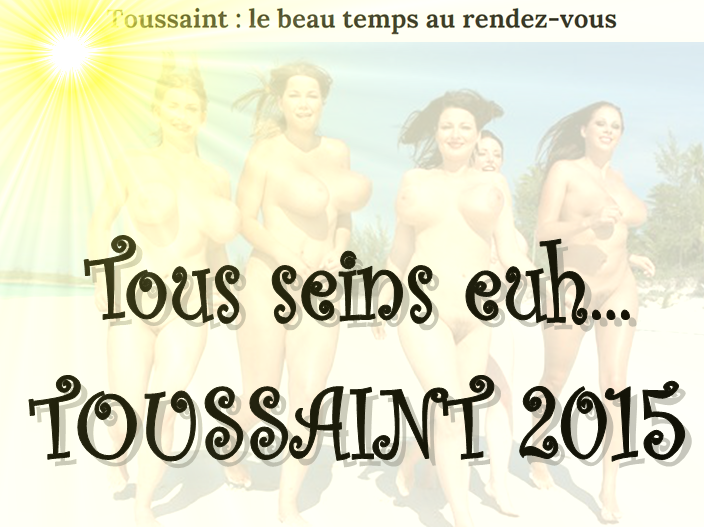 Un temps de euh… toussaint. C'est plutôt un temps à damner un saint. Maintenant, (en parlant de tous seins…) je comprends mieux le réchauffement climatique... La fête de tous les seins ça réchauffe EL MAGNIFICO C’est mortel... --- Dicton sur la Toussaint--- A la Toussaint c'est l'été des vieilles, mais il ne dure que quelques heures, quelques jours au plus... A la toussaint El Magnifico devient un Saint Et waouh.... se sent très sein euh… SAIN Bonne fête de la TOUSSAINT C’est ma façon de rendre hommage à... tous ceux qui sont partis de l’autre côté… Attendez-moi, j’arrive. Mais pas encore tout de suite... J’ai encore quelques conneries à faire…