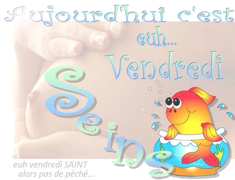 Conseil sans thé euh santé Aujourd’hui c'est vendredi saint... Alors pas de péché... Mais, euh ça ne va pas être facile de ne pas pêcher pour manger du poisson. D’un autre côté...il parait que (de poisson) Cependant pas d'excès... Soyez sérieux Comme disait La Sainte Vierge au petit Jésus "Mange ton pain immédiatement, simon euh sinon tu peux faire une croix... sur tes vacances de Pâques ! ------ Avec la participation des poissons EL MAGNIFIC'Eaux TOUT EST BON dent de la mer euh dans le POISSON Sans frais de PORC